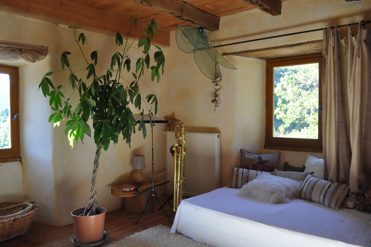 Au rez-de-jardin inférieur, un salon de 20 m2, carrelée de terres cuites fait main, se prolonge d’une cuisine aménagée de 3,56 m2 et d’une salle d’eau de 3,50 m2 avec toilette sèche. La pièce s’ouvre sur une terrasse ombragée par des baies qui encadrent la vue sur la montagne.Un escalier en bois conduit à l’étage vers un palier avec un bureau de 11,33 m2 qui distribue deux chambres de 11 m2 dont une avec une mezzanine. L’ensemble de l’étage a un parquet en bois au sol.