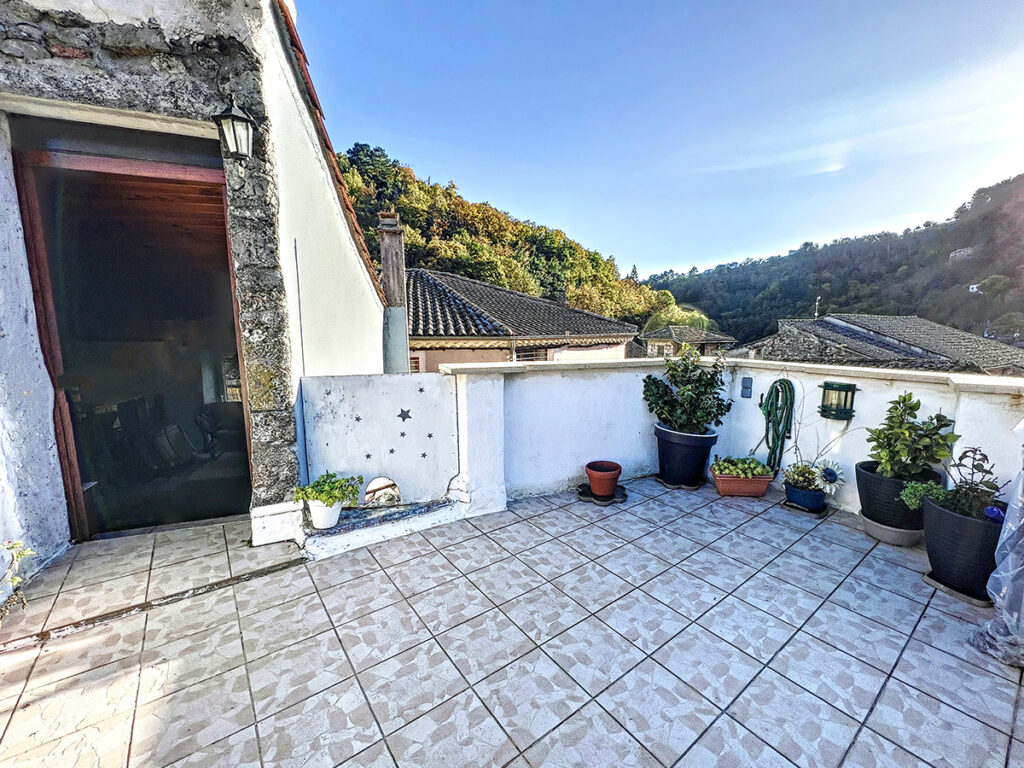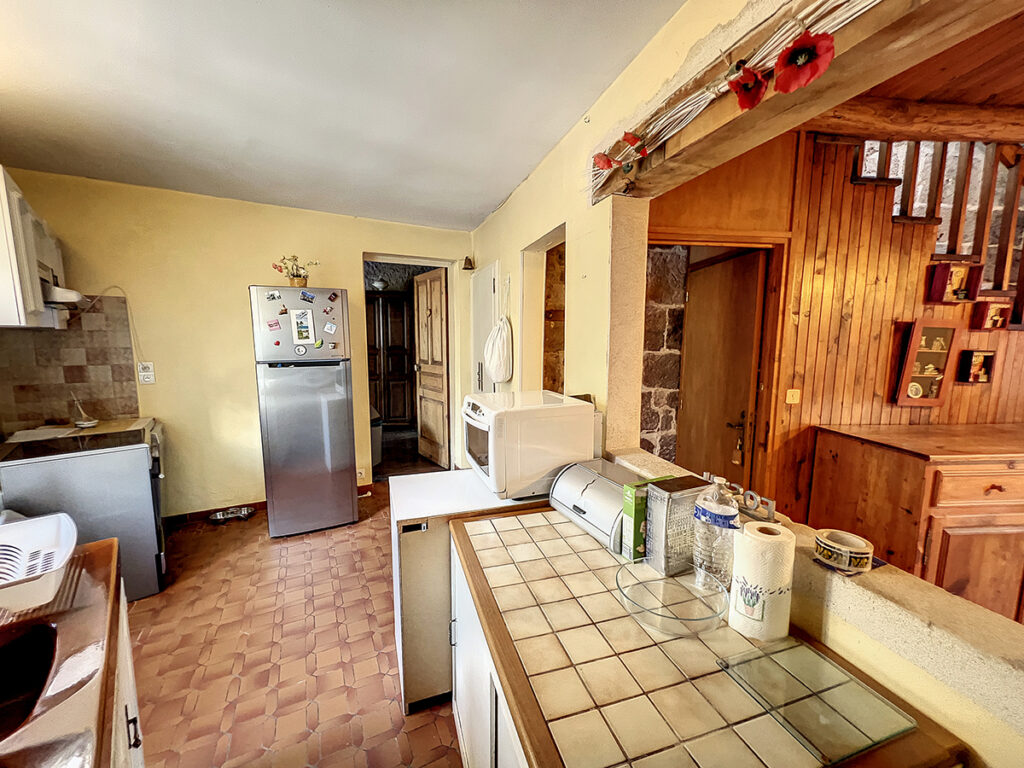 Cette maison datant probablement déjà du 17ème siècle, est située dans un village au charme médiéval avec toutes les commodités et la vie sociale d’un petit bourg touristique. Elle est élevée sur un garage avec un espace atelier et une cave, ainsi qu’une chambre avec une cheminée ouverte pourvue d’une porte de sortie directe sur l’extérieur. Par un bel escalier extérieur en pierre, nous entrons d’abord dans un salon de 21,84 m2 où l’on remarque les murs en pierres apparentes et une niche murale avec un encadrement ornemental, ainsi qu’un poêle à bois. Un escalier en bois permet de rejoindre au rez-de-chaussée inférieur la chambre avec cheminée. Depuis le salon, nous découvrons la cuisine de 10 m2, puis une salle à manger de 16 m2 avec un parquet flottant permettant de rejoindre à l’étage supérieur une chambre de 16 m2 avec une fenêtre Velux et en annexe une salle d’eau et W.C. de 2 m2, puis au même niveau par une pièce traversante de 12,43 m2 avec un escalier vers l’étage supérieur où se situe une pièce de 16,31 m2 vers la terrasse de 10 m2 permettant d’admirer le village et ses bâtiments historiques, ainsi qu’un second escalier vers l’étage inférieur pour rejoindre une pièce de 15 m2, elle-même communiquant au rez-de chaussée avec une pièce de 11,67 m2 puis la partie remise voûtée de 12,27 m2, atelier et garage de 49,3 m2. Toujours au même niveau que la cuisine se situe un W.C. et un dégagement permettant de rejoindre un niveau plus bas, une chambre de 17,16 m2 avec en annexe une salle de bains de 8 m2.