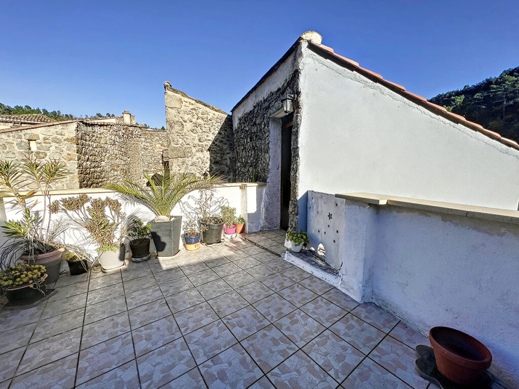 A 15 minutes au Sud d’Aubenas, une maison de village au charme typique, 155 m2 habitables avec terrasse, située dans le cœur historique d’un village avec toutes les commodités. Elle comprend 10 pièces principales : un séjour, une cuisine, une salle-à-manger, deux chambres avec salle d’eau, et salle de bains, 3 W.C., une chambre avec cheminée et sortie extérieure, 4 pièces traversantes à usage de chambre ou bureau, une remise voûtée un atelier et un garage. Une seule mitoyenneté. Chauffage central au fuel. Toiture récente avec isolation, double vitrage. Relié au tout-à-l’égout.