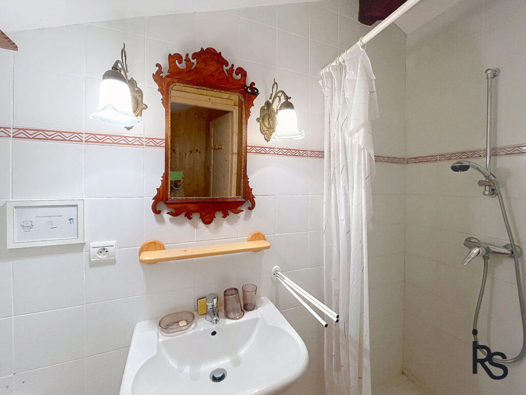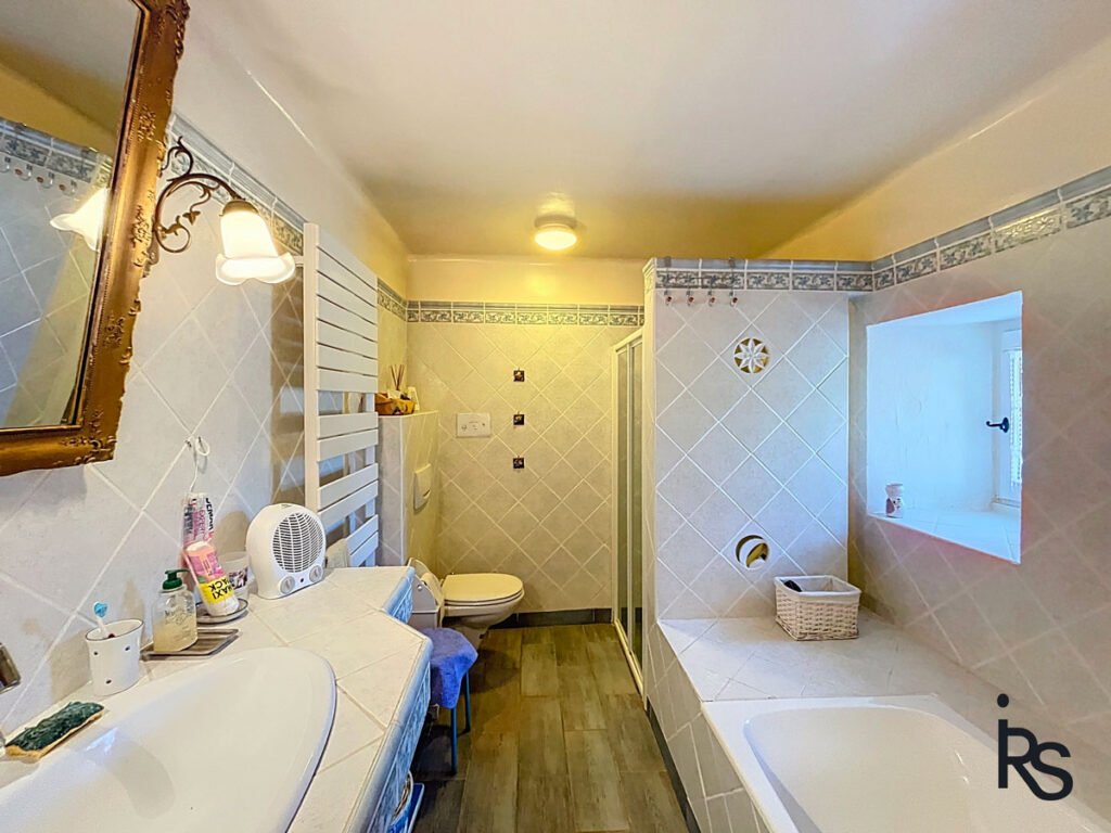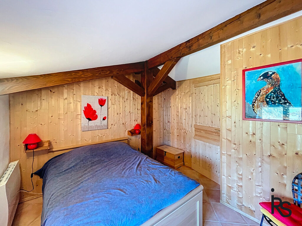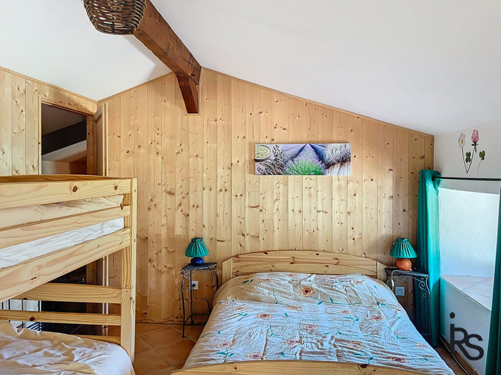 Quelques marches plus bas, la cuisine restera équipée. Au même niveau, nous découvrons une chambre de 16 m2 avec une salle de bains de 8 m2 (baignoire, douche, lavabos, WC). Une porte-fenêtre s’ouvre sur la terrasse. Quelques marches plus haut un petit coin bureau de 6 m2 sur un palier permet de rejoindre deux chambres de… et… m2 avec une salle d’eau (douche, lavabo, WC). L’une des deux chambres s’ouvre également sur une petite terrasse très intime.
