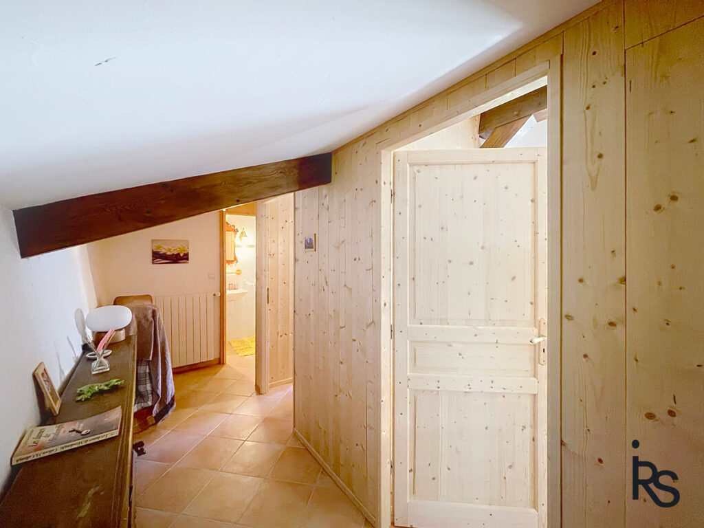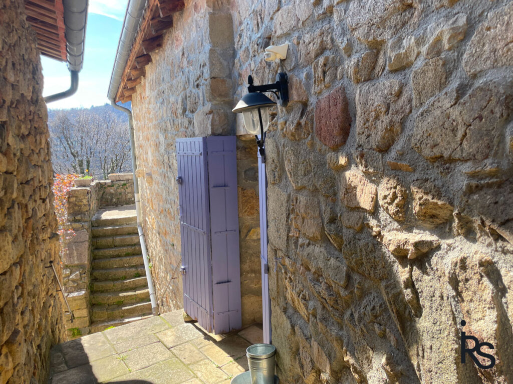 Par l’arrière de la maison une autre entrée de la propriété permet de rejoindre le garage et le parking privatif, de plain-pied avec le niveau supérieur de la grange.