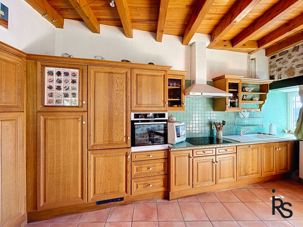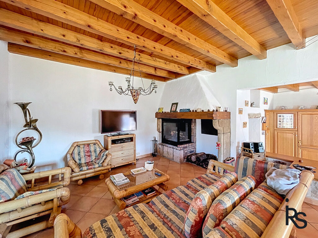 La maison s’ouvre au rez-de-jardin supérieur sur une entrée qui permet de rejoindre la salle à manger de 16,17 m2 ouvert sur le salon de 36 m2 avec une belle cheminée ancienne pourvue d’un foyer fermé.