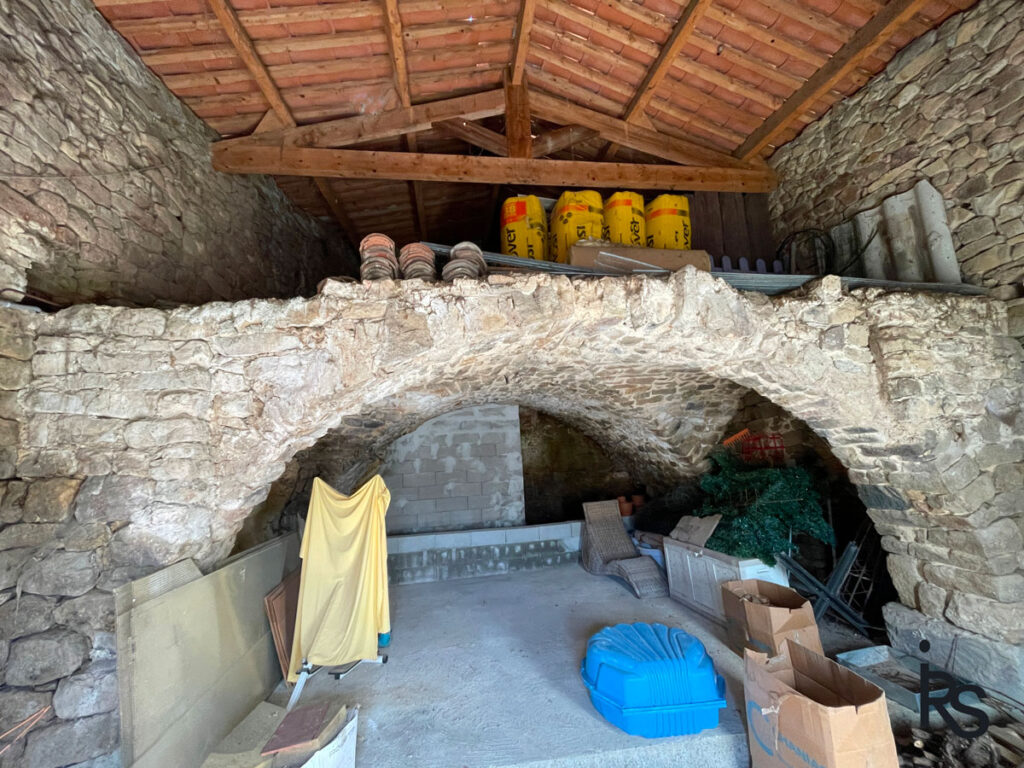 Séparée par une terrasse dallée de l’ancienne grange à la toiture rénovée et prête à être aménagée en surface habitable d’environ 50 m2, la demeure s’élève sur 2 caves voûtées. L’une accueille la chaufferie, l’autre à usage de buanderie est carrelée et s’équipe d’une petite salle d’eau. Deux terrasses, au Sud et à l’Ouest agrémentent le premier niveau de plain pied avec le jardin pour celle qui est couverte.