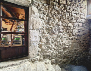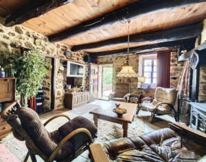 The house is build on 4 vaulted cellars that communicate and an internal stone staircase allows to reach them from the living room. The house opens onto the living room of 31m2 which includes a fireplace a stove and a kitchenette. Two lower steps, a dining room of 12,51 m2, open to the living room, gives access to the bathroom (bath and shower) of 6.74m2 and a separate W.C. with a laundry area of 3.5m2.
