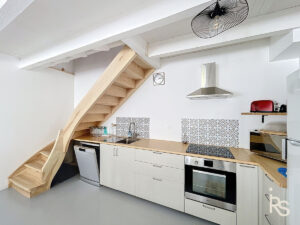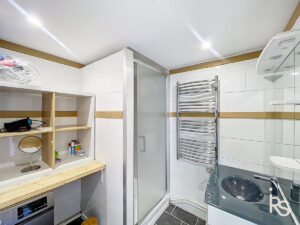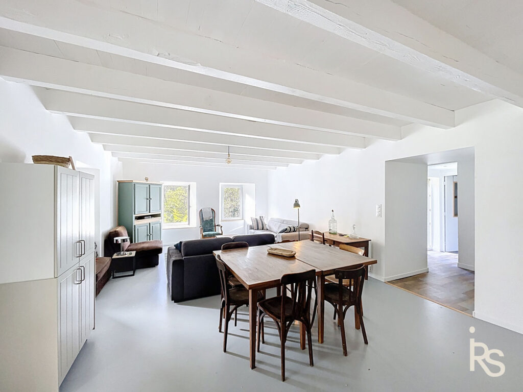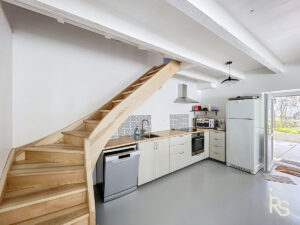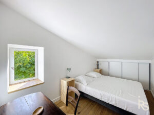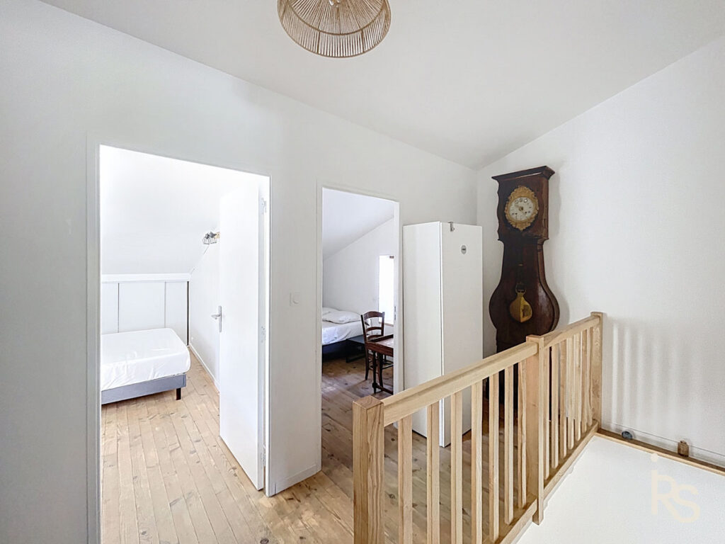 In the living room, a beautiful carpenter’s staircase leads to the first floor, which has three bedrooms, two of which are attic rooms measuring 12.92 m² and 10.75 m² with cupboards, and the third measuring 10.49 m². A hallway leads to a 23 m² L-shaped space that could be converted into a bedroom with a private bathroom if required, as well as a garage. On the garden level is a large cellar, ideal for storage.