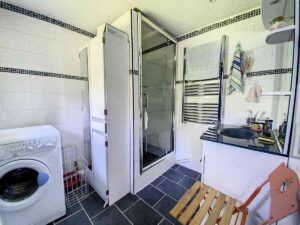 We enter the house through a large terrace partially covered. The living room of 38m2, located on the lower ground floor, is equipped with a kitchen area and a pellet stove. On the same floor, we find a shower room of 4.92m2 and a separate W.C as well as a clearance of 5.17m2 for laundry use that allows us to join the garden.
