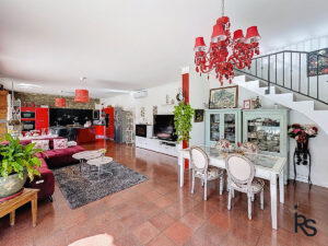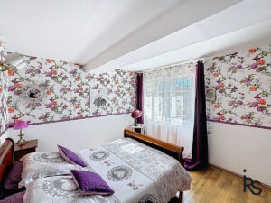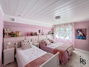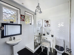 One level below, on the upper garden level, there are three bedrooms – one of which has a large, fitted wardrobe – and two shower rooms with a toilet. On the same level, the house features a large garage, a utility room and a boiler room.