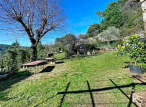 Voor het huis strekt zich een tuin uit naar het westen met uitzicht op het zuiden, met daarin een betonnen zwembad van 4 m x 8 m dat moet worden opgeknapt. In de buurt bevinden zich andere percelen waar een moestuin kan worden aangelegd, evenals een oude carport.