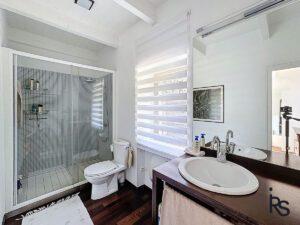 Het huis komt uit op een ruime woonkamer van 44,40 m² met een eethoek, een houtkachel en een open haard, een ingerichte keuken van 14,44 m² met een berging van 1,74 m² en een toilet. Op de eerste verdieping bevinden zich 4 slaapkamers van 15,20 m², 14,00 m², 16,65 m² en 14,58 m², en een badkamer van 5 m². De eerste slaapkamer buiten en de laatste heeft een badkamer van 5,88 m² met toilet.