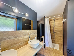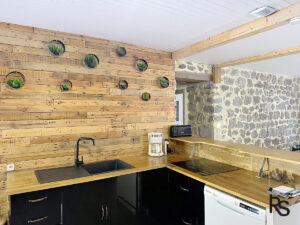 Het huis komt uit op een eetkeuken van 22,11 m², een woonkamer van 23,18 m² die uitkomt op deze keuken en is uitgerust met een pellet kachel. Op hetzelfde niveau bevinden zich twee slaapkamers van 18,47 m² en 12,62 m², evenals een badkamer met toilet en een werkplaats die als wasruimte wordt gebruikt. Een binnenplaats geeft toegang tot een terras. Op de eerste verdieping bevinden zich twee slaapkamers van 11,89 m² en 11,17 m² en een badkamer met toilet van 3,90 m². Op dezelfde verdieping verbindt een deur de gîte met het hoofdgebouw.